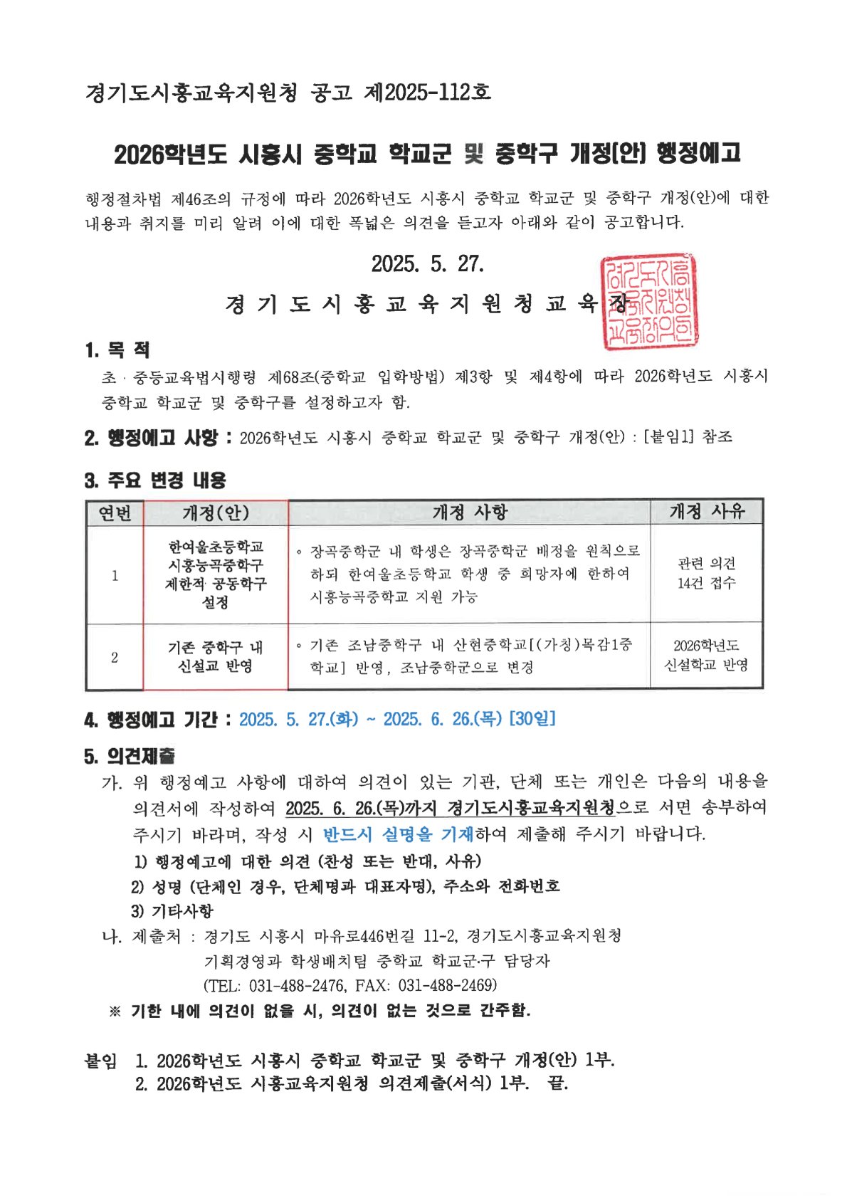 °æ±âµµ½ÃÈï±³À°Áö¿øÃ» ±âȹ°æ¿µ°ú_3. 2026Çг⵵ ½ÃÈï½Ã ÁßÇб³ Çб³±º ¹× ÁßÇб¸ °³Á¤(¾È)¿¡ ´ëÇÑ ÀǰßÁ¦Ãâ¼­(¼­½Ä).hwp (25.50KB)